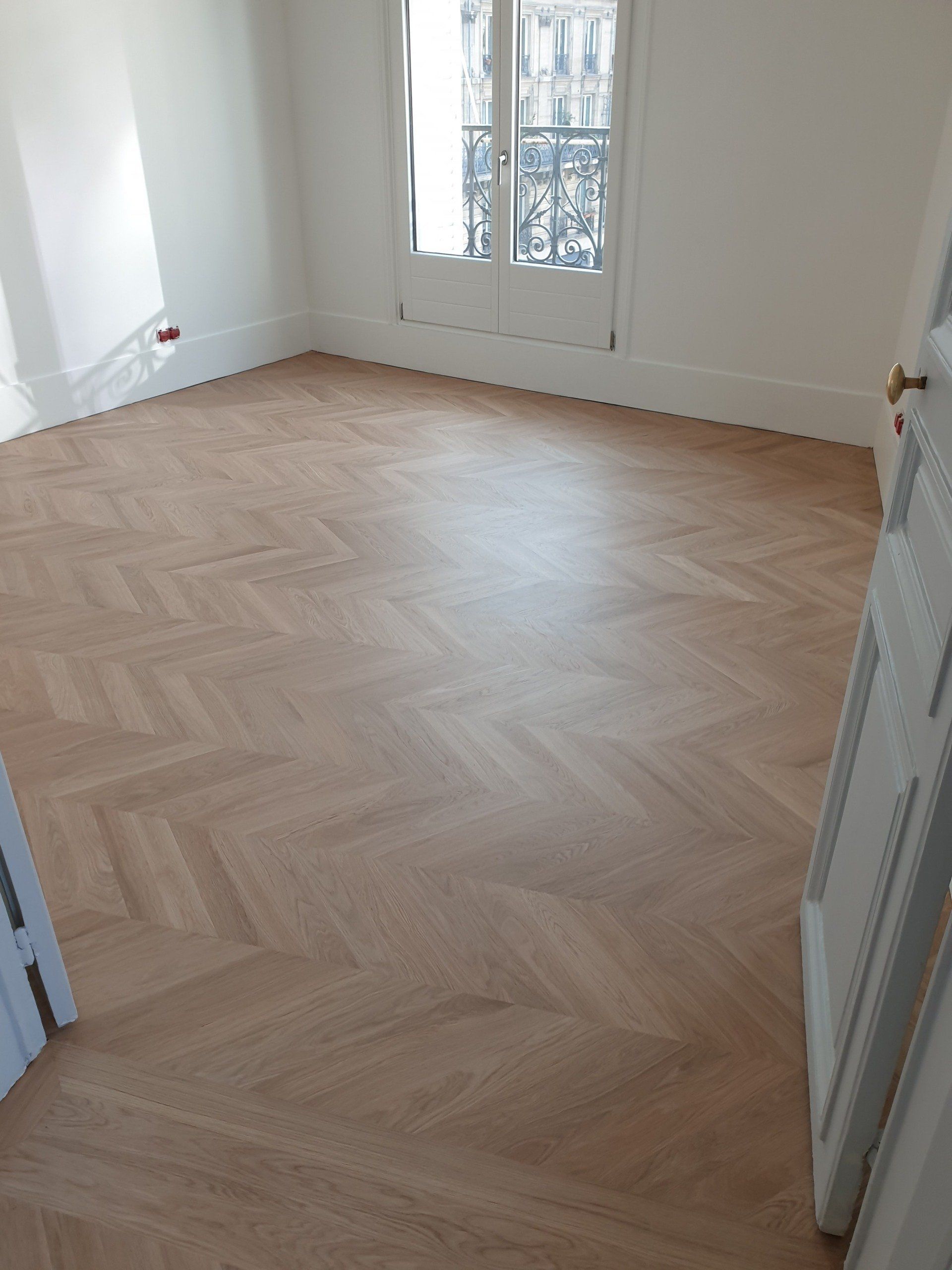 pose parquet point hongie et ponçage et vitrification aspect bois brut en phase aqueuse
